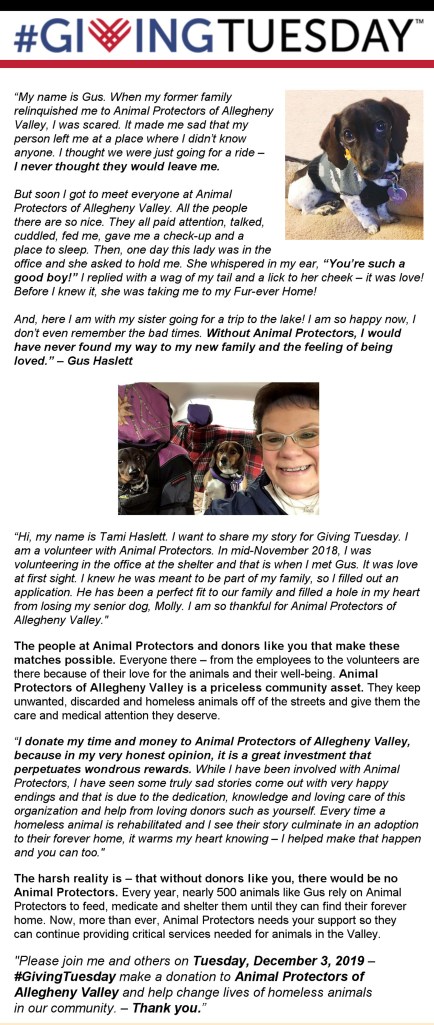 PORTFOLIO This is a Giving Tuesday Digital Appeal I wrote and designed for Animal Protectors of Allegheny Valley. The Appeal brought in nearly $6000. This Giving Tuesday NOW Appeal brought in approximately $5500 for Animal Protectors of Allegheny Valley. Share this:TweetLike Loading...